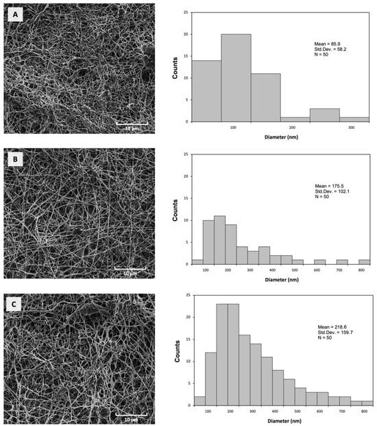 SEM images (left) and diameter distributions (right) showing morphological features of electrospun PCL scaffolds. The scaffolds were obtained from 10% w/v pure PCL in ethyl acetate, with 2% w/v SS, 0.5% w/v PVA, and (A) 1.5 μg/g, (B) 3.0 μg/g and (C) 7.0 μg/g of CIP. Fiber diameter distribution of (A–C) scaffolds with mean ± SD for 50 nanofibres.