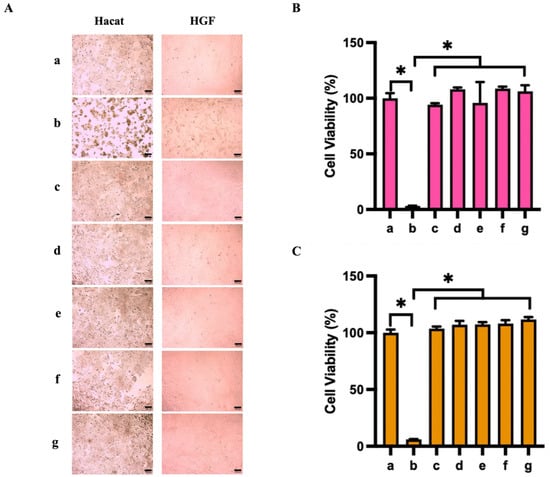 (A) The proliferation of HaCaT and HGF cells under multiple treatments and (B,C) MTT assay results of (a) TCP (vehicle control), (b) 6.4 μg/mL CIP (positive control), (c) PCL (negative control), (d) PCL/1% SS-PVA-CIP (3.0 μg/g), (e) PCL/2% SS-PVA-CIP (3.0 μg/g), (f) PCL/1% SS-PVA-CIP (7.0 μg/g) and (g) PCL/2% SS-PVA-CIP (7.0 μg/g). Data were analysed using one-way ANOVA and Tukey analysis, n = 6; mean ± SD; * p ≤ 0.05.