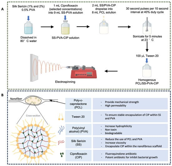 (A) Schematic of the PCL/SS-PVA-CIP nanofibre fabrication process. (B) The cross-sectional area of the encapsulation of CIP within SS and PVA with Tween 20.