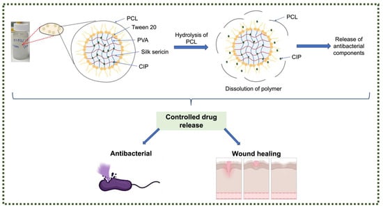 The accelerated degradation rate in scaffolds with a higher SS concentration suggests that the increased ratio of SS to PCL enhances the scaffold’s biodegradability. Scheme 2 illustrates the controlled drug release mechanism from the nanofibre scaffolds, designed to optimize therapeutic effects. The scaffold composition, primarily PCL, is key due to the properties of PCL as a biodegradable polymer that effectively incorporates bioactive components. Given that PCL alone demonstrates limited degradation properties, the integration of natural polymers like SS is shown to significantly augment its biodegradability []. As shown in Figure 3A,B, increasing the concentration of SS and incorporating PVA enhances the hydrophilicity of the scaffolds. This increased hydrophilicity is critical, as it ensures that upon immersion in an aqueous environment, the scaffolds facilitate a gradual release of encapsulated antibiotics. This mechanism mitigates the burst release typically observed with less hydrophilic materials, promoting a more controlled drug release. The scaffold’s slow water absorption permits a steady diffusion of CIP from regions of higher concentration within the delivery system to lower concentrations in surrounding tissues or fluids. This diffusion, driven by the drug concentration gradient, is the primary mode of release. Moreover, as the scaffold degrades or is absorbed by the body, this process further modulates the CIP release rate, emphasizing the importance of synchronizing the degradation timeline with drug release to maintain therapeutic levels throughout the treatment period.