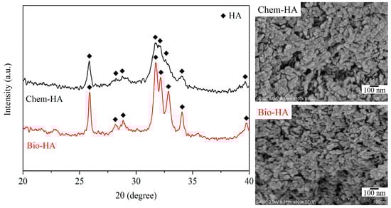 3.1. Structural and Morphological Analysis of Chem-HA and Bio-HA Powders before and after Cu Ion Adsorption