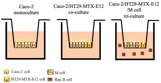Schematic diagram of intestinal culture models. Monoculture of Caco-2 cells, co-culture of Caco-2 cells with HT29-MTX-E12 cells, tri-culture of Caco-2 cells with HT29-MTX-E12 cells and M cells induced by Raji B cells.