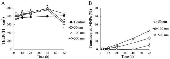 To assess the impact of MNPs on the barrier function of Caco-2 cells, we monitored the daily changes in the TEER values of the Caco-2 cell layer (Figure 3A). The results demonstrated that the MNPs significantly affected the integrity of the Caco-2 monolayer. All sizes of MNPs led to an increase in TEER values up to 48 h, followed by a decrease at 72 h. Notably, the 50 nm and 100 nm MNPs exhibited a significant reduction in TEER values compared to the control after 72 h of exposure, which indicated that the potential toxicity of MNPs on Caco-2 cells and smaller MNPs such as 50 nm and 100 nm MNPs is more critical than 500 nm MNPs.