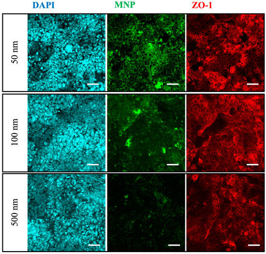 Confocal microscopy was conducted to observe the localization of exposed MNPs in the Caco-2 monoculture. Cyan: DAPI, Green: MNPs, Red: ZO-1. Scale bars = 50 µm.
