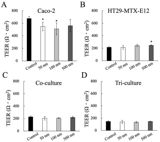 Effect of MNP exposure on Caco-2 cells barrier integrity. (A) Caco-2 monoculture, (B) HT29-MTX-E12 monoculture, (C) co-culture of Caco-2 with HT29-MTX-E12, (D) tri-culture of Caco-2 with HT29-MTX-E12 and M cells. Data shown represent the mean ± SD (n = 6) from three independent experiments, (* p < 0.01).