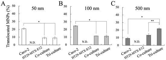 Translocation of MNPs in each culture condition. (A) MNP 50 nm, (B) MNP 100 nm, (C) MNP 500 nm. Data shown represent the mean ± SD (n = 6) from three independent experiments, (* p < 0.01, ** p < 0.05).