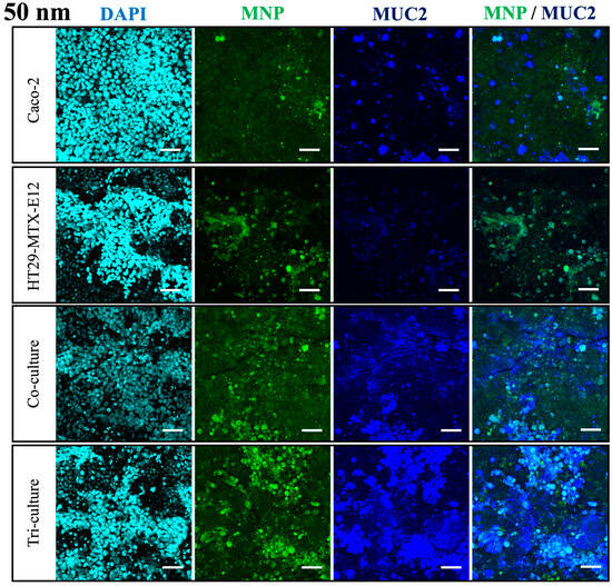 From the permeability measurements, we observed the translocation of MNPs in the Caco-2 monoculture, co-culture, and tri-culture, whereas the monoculture of HT29-MTX-E12 did not exhibit MNP translocation (Figure 6). Furthermore, translocation of 50 nm and 100 nm MNPs were inhibited by HT29-MTX-E12 cells, suggesting the mucus disturbs the penetration of particles. Interestingly, the permeability of 500 nm MNPs was not affected much by HT29-MTX-E12 cells in this result, which conflicts with previous findings, since the permeability in the mucus is known to decrease with larger particle size []. On the other hand, from the confocal microscopy, we observed significant expression of mucus protein MUC2 in the culture with HT29-MTX-E12 cells, and MNPs were localized on the MUC2 (Figure 7). These results indicate the protective role of the HT29-MTX-E12 cells, producing mucus to capture the MNPs to inhibit the translocation.