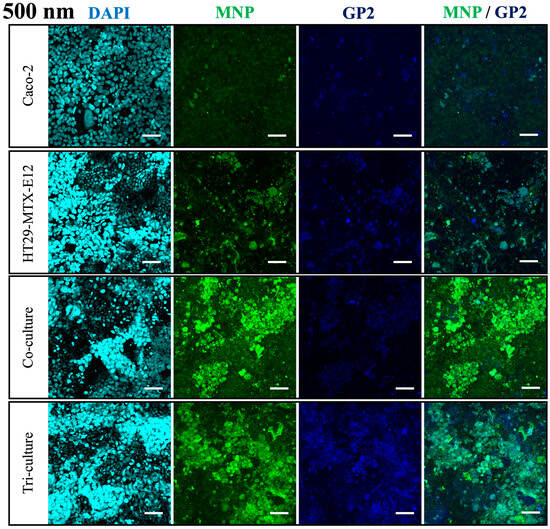 Moreover, the permeability of 500 nm MNPs was significantly increased in the tri-culture incorporating M cells (Figure 6C) when compared to the Caco-2 monoculture and co-culture, while the translocation of 50 nm and 100 nm MNPs remained unaffected under tri-culture (Figure 6A,B). Overall, considering the results from the Caco-2 monoculture, the translocation of 50 nm and 100 nm MNPs is considered to mainly depend on Caco-2 cells, and larger 500 nm MNPs mainly depend on M cells. Moreover, the confocal microscopy revealed the expression of GP2 in the tri-culture, which is a marker of M cells, proving the M cell induction is successful, and the overlay of GP2 expression with 500 nm MNP localization suggested the uptake of 500 nm by M cells (Figure 8). On the other hand, in the basolateral compartment of the tri-culture, where the Raji B lymphocyte cell line was inoculated for M cell induction, we observed that the translocated MNPs were taken up by the Raji B cells (Supplementary Figure S2). This suggests that in the human body, MNPs transported by M cells could be re-uptaked by immune cells, as the basolateral side of M cells is rich in immune cells.