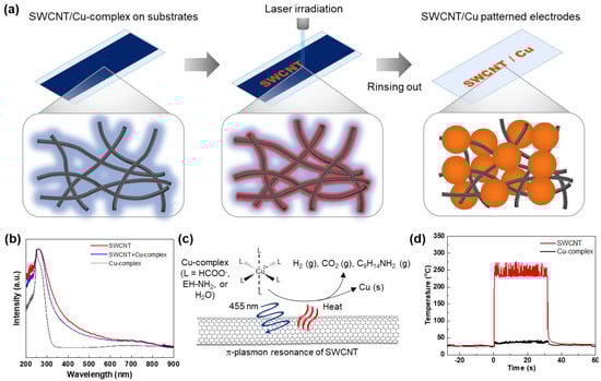 Laser-induced photo-thermal reaction for ultrafast preparation of the SWCNTs/Cu hybrid electrodes. (a) Schematic of fabrication process of patterned SWCNT/Cu electrodes. (b) UV–vis absorption spectra of Cu-complex, SWCNT/Cu-complex, and SWCNT. (c) Demonstration of photo-thermal and chemical reactions of SWCNT/Cu-complex producing metallic Cu. (d) Temperature profiles of SWCNT and Cu-complex when irradiated using laser at 455 nm.