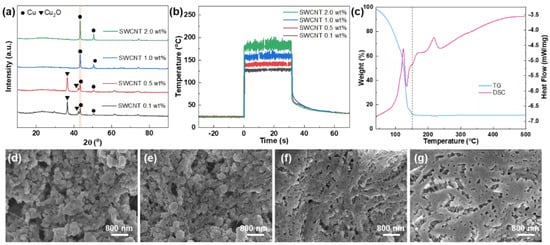 SWCNT concentration dependence on photo-thermal reaction. (a) X-ray diffraction patterns of SWCNT/Cu electrodes and (b) temperature profiles during laser irradiation of SWCNT/Cu-complex films at different SWCNT concentrations on glass substrates. (c) Thermogravimetry and differential scanning calorimetry curves of Cu-complex at a heating rate of 5 °C min−1 under air flow of 100 mL min−1. Scanning electron microscopy (SEM) images of SWCNT/Cu electrodes at SWCNT concentrations of (d) 0.1 wt%, (e) 0.5 wt%, (f) 1.0 wt%, and (g) 2.0 wt%.