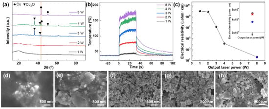 Laser power dependence on photo-thermal reaction. (a) X-ray diffraction patterns of 0.1 wt% SWCNT/Cu electrodes with respect to laser irradiation power, (b) temperature profiles during laser irradiation, and (c) electrical resistivity of SWCNT/Cu electrodes fabricated with various laser powers on a glass substrate. Electrical resistivities of thermally treated samples of Cu-complex (blue star) and 0.1 wt% SWCNT/Cu (red star) in the furnace are shown in the inset. (d–h) SEM images of SWCNT/Cu electrodes irradiated with output laser powers of 1, 2, 3, 4, and 8 W, respectively.