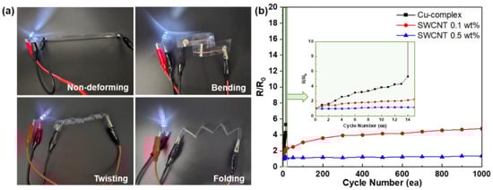 In addition, we examined the flexibility of patterned electrodes under deformation (Figure 5a). Under various deformation states, such as 360° bending, twisting, and even 180° folding, the electrical properties of the SWCNT/Cu electrodes were maintained, as demonstrated by LED lightning. This finding was attributed to the well-dispersed, highly flexible SWCNT networks hybridized with highly conductive Cu nanostructures, as previously observed in the SEM images. For further evaluation of high durability, long-term bending tests for the SWCNT/Cu electrodes with 0.1 and 0.5 wt% SWCNTs were performed (Figure 5b). For comparison, Cu electrodes were fabricated by thermal treatment of the Cu-complex without SWCNT hybridization. For the Cu electrodes, the resistance change (R/R0) dramatically increased to 5455 even after 15 bending cycles under deformation conditions with a bending radius of 5R, whereas 0.1 wt% SWCNTs with Cu-complex samples retained an R/R0 value of 4.467 at 1000 bending cycles. Moreover, 0.5 wt% SWCNTs in the Cu-complex sample exhibited extremely high durability, with an R/R0 value of 1.281 after 1000 bending cycles. These results indicated that SWCNTs can act as efficient electrical and mechanical supports for hybrid materials under severely deformed conditions.