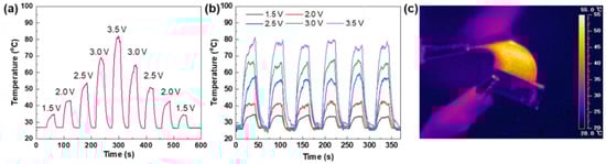 The SWCNT/Cu electrodes on the PET substrates can also be used as electrothermal film heaters, as shown in Figure 6. With increasing voltage from 1.5 to 3.5 V with a step size of 0.5 V, the SWCNT/Cu electrodes demonstrated a fast temperature increase, as shown in Figure 6a, indicating that the electrode temperature is readily adjusted by controlling the voltage. At an applied voltage of 3.5 V, the electrode temperature reaches 80 °C within 17 s, and this maximum value remains unchanged during repeated cycling, although a minute temperature fluctuation in the on-state is observed (Figure 6b). In addition, as shown in Figure 6c, a uniform temperature distribution of the electrode is observed in the IR camera image, indicating a negligible change in the electrode resistance and a well-interconnected SWCNT/Cu hybrid material with high flexibility. The Joule heating performances with high flexibility for the SWCNT/Cu electrodes are comparable to previous results for CNT/metal hybrid materials-based flexible electrodes [19,42].