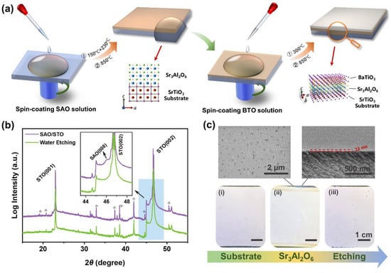 Recently, a water-soluble strontium aluminate (Sr3Al2O6, SAO) sacrificial layer, applied to many perovskites and their heterostructures, has been reported, attracting unprecedented attention and leading to the development of freestanding perovskite oxide thin films [6,13,14,15]. Compared to conventional acid-etching, the laser lift-off process, inductively coupled plasma-reactive ion etching, and other ways of preparing self-supported thin films [16,17,18,19,20], the use of this layer has the advantages of being environmentally friendly and having a wide range of applications. In addition, perovskite oxide thin films with independence, transferability, and high-quality single-crystal thin film states can be achieved by using a water-soluble SAO sacrificial layer. For example, freestanding single-crystal ferroelectric barium titanate (BaTiO3, BTO) thin films with super elasticity and ultraflexibility were synthesized using PLD in the presence of an SAO sacrificial layer [21], which exhibited stress-activated modulation of electric dipole rotation. Huang et al. reported that sub-one-nanometer transferrable ultrahigh-κ single-crystal strontium titanate (SrTiO3, STO) films integrated with two-dimensional layered semiconductors effectively reduced capacitance equivalent thickness and thus allowed the obtainment of high-quality dielectric–channel interfaces [22]. Additionally, based on the SAO water-soluble layer, researchers have conceived of the idea of transferring high-density switchable skyrmion-like polar nanodomains onto silicon, which is important for the application of the rich physical properties of single-crystal oxides [23]. Despite the many reports on the realization of freestanding perovskite oxides thin films based on the use of SAO sacrificial layers, it is still challenging to reduce the preparation threshold and simplify the preparation methods as these films are mainly synthesized based on high-vacuum techniques, such as reactive MBE and PLD techniques [24,25]. In order to develop a cost-effective method, Salles et al. obtained freestanding CoFe2O4 membranes by combining atomic layer deposition and solution deposition processing using a sacrificial layer of SAO [26], providing a good idea for further research on the development of self-supported oxide films [27].