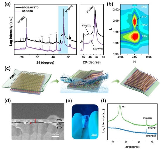 X-ray diffraction pattern (a) and synchrotron X-ray reciprocal space mappings (b) of BaTiO3/Sr3Al2O6/SrTiO3 heterogeneous structures. A schematic of the release process of BaTiO3 films from the substrate (c). Cross-sectional SEM image of the Sr3Al2O6 layer in the middle of the heterostructure after one day of immersion in deionized water (d). Optical microscopy images of freestanding BaTiO3 film (5 × 5 mm) released on polydimethylsiloxane (e). X-ray diffraction pattern of the freestanding BaTiO3 films on the polydimethylsiloxane and polyethylene terephthalate flexible layer (f).