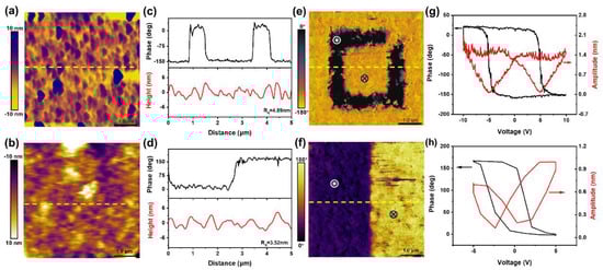 Considering the stability of the quality and properties of the BTO film after it was peeled from the substrate, we first investigated the morphological changes of the films before and after release using atomic force microscopy (AFM). The surface morphologies before and after the release are shown in Figure 4a and Figure 4b, respectively. It can be observed that there is variability in their morphology, which may be due to the fact that the front and back sides of the film were reversed with respect to each other after the film had been released on the flexible substrate. The red curves in Figure 4c,d indicate the surface height undulations along the yellow dashed line down in Figure 4a and Figure 4b, respectively. Furthermore, the root-mean-square roughness values of the BTO films before and after the release are 4.89 and 3.52 nm, respectively. Therefore, this change in root-mean-square roughness could also be caused by the reversal of the front and back surfaces of the film during release. Furthermore, the ferroelectric properties of the BTO films were probed through piezoresponse force microscopy (PFM) using conductive AFM tip scanning across a 5 μm × 5 μm area. The out-of-plane PFM phase signals of the original and post-release films at ±10 V polarization are shown in Figure 4e and Figure 4f, respectively. The black curves in Figure 4c,d represent the phase signals along the yellow dashed line down in Figure 4e and Figure 4f, respectively, which suggest a significant phase inversion between regions previously exposed to positive or negative bias. Crucially, this finding suggests that opposite polarization states exist between the two regions and can be switched via an applied voltage. The local hysteresis loops in phase and amplitude are also evidence of freestanding BTO film ferroelectricity, a finding that is consistent with the pre-transfer film having a phase flip of nearly 180° and a butterfly amplitude curve (Figure 4g,h). At the same time, the freestanding BTO film still exhibited polarization switching in response to the electric field under cyclic polarizations (Figure S6), indicating that the ferroelectricity of the BTO films was maintained after release from the substrate. The domain walls can still be observed after ten minutes in the phase and amplitude images, further indicating that the film is ferroelectric (Figure S7). Therefore, by combining all the analysis results, we can conclude that the preparation of freestanding perovskite oxide single-crystal thin films via full-solution deposition is technically feasible. The successful application of this method will provide unprecedented opportunities for the development of low-dimensional materials.