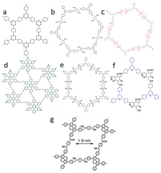 (a): Boron-based COFs [16], (b): imine-based COFs [34], (c): hydrazone-based COFs [35], (d): azine-based COFs [36], (e): imide-based COFs [37], (f): ketoenamine-based COFs [38], and (g): sp2 carbon-conjugated COFs [39].