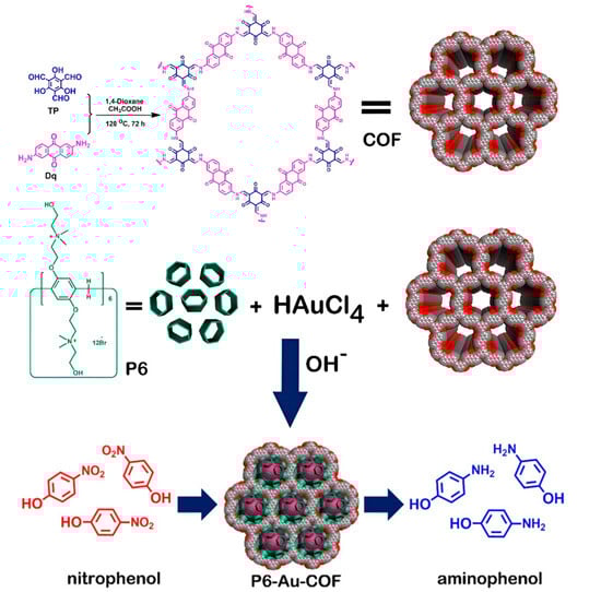 Synthesis of COF, P6-Au-COF nanomaterial, and its application in catalyzing a reduction in nitrophenol isomers [90].