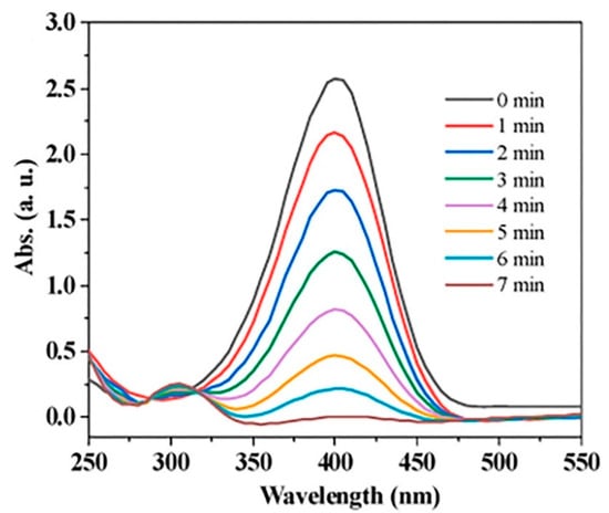 Time-dependent UV–vis spectra of the reduction in 4-NP catalyzed by Cu@TAPB-PCBA (0.4 mg/mL) [116].