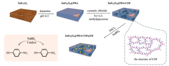 ZnFe2O4@PDA/COF@Pd was synthesized by Lv et al. [122]. In this study, ZnFe2O4, characterized by a wood-like structure, was encapsulated in polydopamine, followed by the deposition of a COF layer as a platform for Pd nanoparticles. Subsequently, the introduction of Pd nanoparticles led to the development of a catalyst for the reduction in 4-nitrophenol. Notably, the size of the Pd nanoparticles exceeded the COF pores, resulting in their positioning between the layers of the COF. The abundance of nitrogen in the COF structure facilitated the strong adhesion of the Pd nanoparticles to the COF layers, thereby preventing their loss. Moreover, owing to its magnetic properties, the catalyst could be rapidly recovered using an external magnetic field, and even after five uses, its performance remained above 97%. Overall, the catalyst’s outstanding activity and stability can be attributed to (i) the presence of nitrogen atoms in the COF structure, enabling the effective binding of Pd nanoparticles, (ii) the interaction between Fe ions in ZnFe2O4 and polydopamine, and (iii) the placement of COF on polydopamine through a reaction involving chlorine atoms and amino groups (Figure 7) [123].