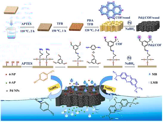 - Cui, Z.; Wu, J.; Wu, T.; Xu, Y.; Li, H.; Yu, Y.; Kang, L.; Cai, Y.; Li, J.; Tian, D. Novel wood membrane decorated with covalent organic frameworks and palladium nanoparticles for reduction of aromatic organic contaminants. Sep. Purif. Technol. 2023, 319, 124112. [Google Scholar] [CrossRef]