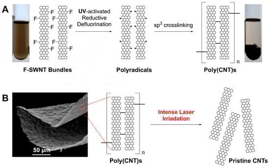 (A) Generation and recombination of free radicals in F-SWNT bundles to form poly (CNTs), as described in our previous work []. (B) Thermal stability of crosslinked CNTs studied in this work.