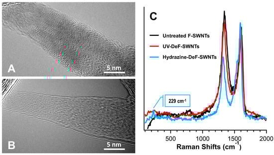(A) TEM images of untreated F-SWNTs and (B) UV-crosslinked F-SWNTs. (C) Raman spectra of untreated, UV-defluorinated, and hydrazine-defluorinated F-SWNTs, recorded using a 532 nm laser wavelength with a power density of 2.9 kW/mm2.