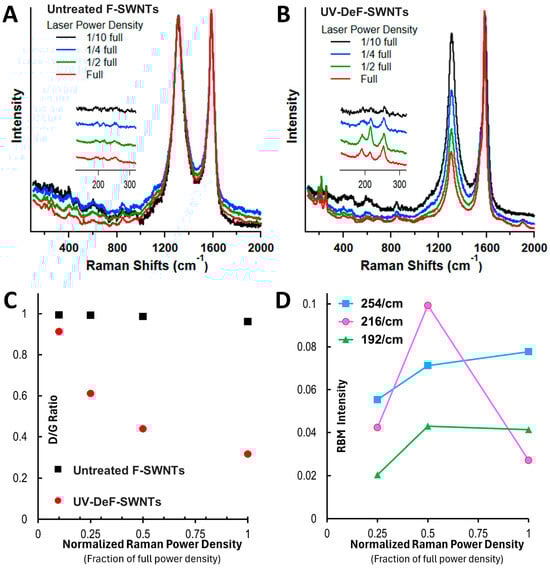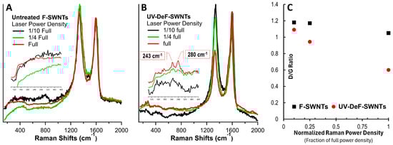 Raman spectra of (A) untreated F-SWNTs and (B) UV-defluorinated crosslinked F-SWNTs. (C) D/G ratio of untreated F-SWNTs and UV-DeF-SWNTs as a function of the fraction of full Raman laser power density. The Raman laser wavelength is 532 nm, with a full laser power density of 2.9 kW/mm2. Insets in (A,B) show amplified RBM bands.