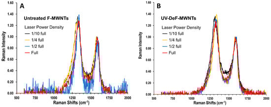 Raman spectra of (A) untreated F-MWNTs and (B) UV-DeF-MWNTs. Laser wavelength: 532 nm, with a full power density of 2.9 kW/mm2.