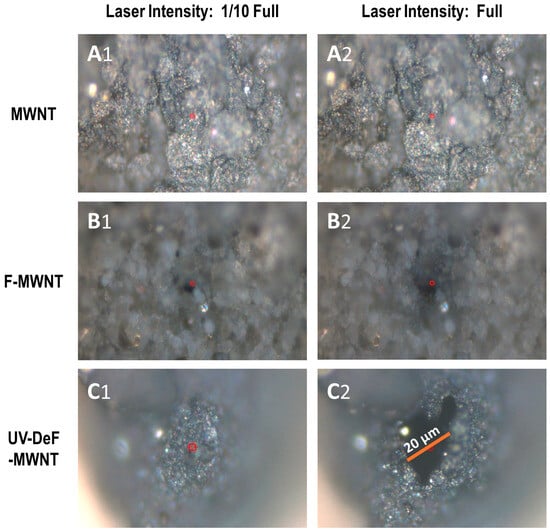 Microscope images of the Raman laser-irradiated sample areas: (A1,A2) pristine SWNTs, (B1,B2) untreated F-SWNTs, and (C1,C2) crosslinked UV-DeF-SWNTs irradiated at 1/10 (Column 1) and full (Column 2) power density, respectively. Full power density: 2.9 kW/mm2.