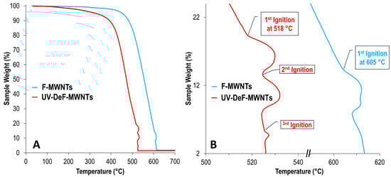 (A) TGA curves of F-MWNTs and UV-DeF-MWNTs. (B) Enlarged view of the ignition and combustion region featured in (A).