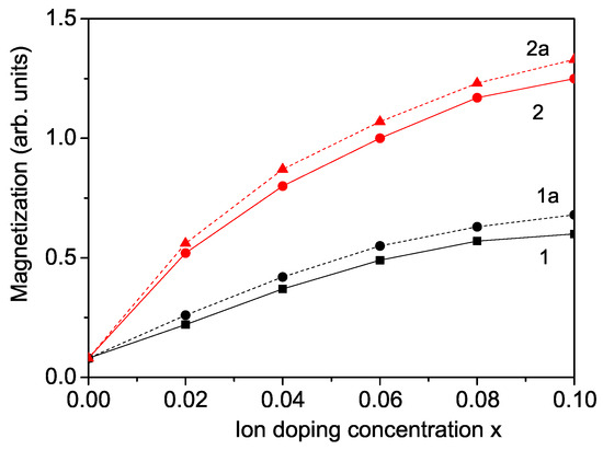 Doping concentration dependence of the magnetization M for a KNO NP: d = 20 nm for (1) Co doping at the Nb site, (2) Cr doping at the Nb site, (1a) La/Co co-doping at the K and Nb sites, (2a) La/Cr co-doping at the K and Nb sites; for T = 300 K, h = 100 Oe.