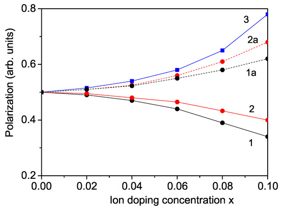 Doping concentration dependence of the polarization P for a KNO NP: d = 20 nm at room temperature for (1) Co doping at the Nb site, (2) Cr doping at the Nb site, (3) La doping at the K site, (1a) La/Co co-doping at the K and Nb sites, (2a) La/Cr co-doping at the K and Nb sites.