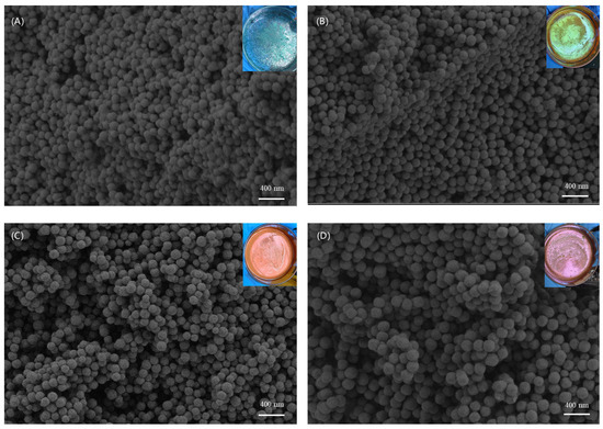 Scanning electron microscopy (SEM) was used to observe the morphology of the fabric surface after spray-coating Cu2O, as shown in Figure 2. Cu2O microspheres with four different sizes were synthesized from different conditions, which were 165 nm, 210 nm, 240 nm, and 275 nm. The photo in the upper right corner corresponds to Cu2O microspheres of different particle sizes exhibiting different colors in a Petri dish. The Cu2O microspheres have smooth surfaces, excellent sphericity, and a uniform size.
