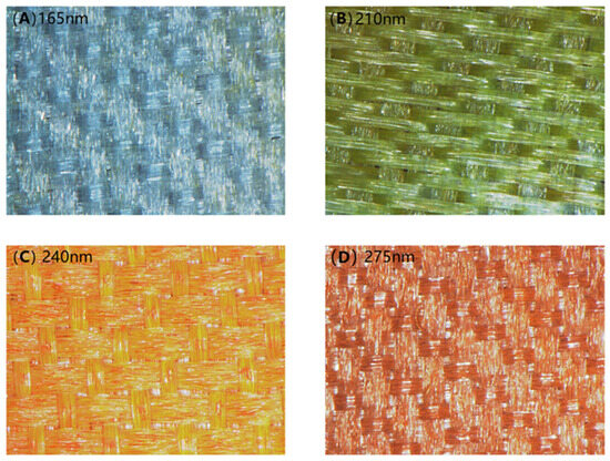 In recent years, Shao et al. have developed a method to create periodic layers of PET films and SiO2 films on polyester fabric surfaces. By varying the particle size or the number of SiO2 nanoparticle cycles, they achieved polyester fabrics in different colors. Moreover, these fabrics exhibit iridescence, displaying distinct rainbow colors at different angles [12]. Lee et al. have also made significant strides by fabricating conductive e-textiles and color-coated e-textiles. They achieved this by depositing multilayers of Al2O3/TiO2 on conductive e-textiles. By adjusting the thickness of the Al2O3 and TiO2 layers, they could change the color of the coated conductive e-textiles to purple, green, or pink, demonstrating versatile color control through layer thickness manipulation [13,14,15].