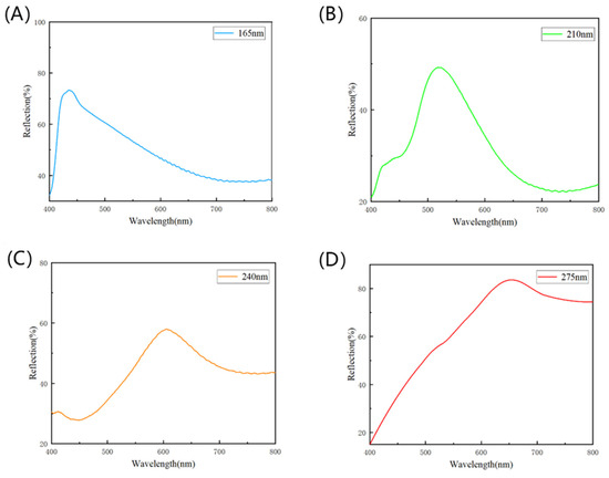 Reflectance curves of structural colored fabrics with different particle sizes of Cu2O microspheres: (A) 165 nm, (B) 210 nm, (C) 240 nm, (D) 275 nm.