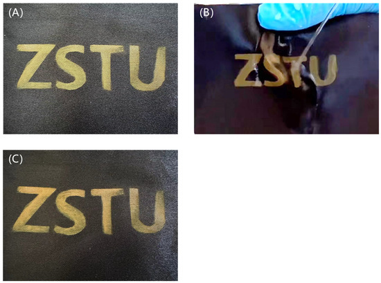 Comparison after washing fastness tests: (A) original fabric, (B) fabric in washing fastness tests, (C) fabric after washing fastness tests.