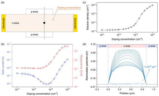 The variation of responsivity with doping concentration is related to electrostatic potential and dark current. As shown in Figure 3d, the higher the doping concentration, the steeper the electrostatic potential on both sides of the channel, that is, the larger the built-in field. A large built-in field is conducive to the separation of photogenerated electron–hole pairs and the formation of large photovoltage, which enables the channel to be effectively modulated, thereby promoting the photocurrent (Iph). However, excessive doping concentration increases the dark current (IDark) and causes the net photocurrent (INet = Iph − IDark) to decrease. Therefore, the responsivity first increases with the increase of doping concentration and then tends to be stable. Based on the simulation results, a doping concentration of about 6 × 1014 cm−3 is more appropriate to obtain a balance between dark current and responsivity.