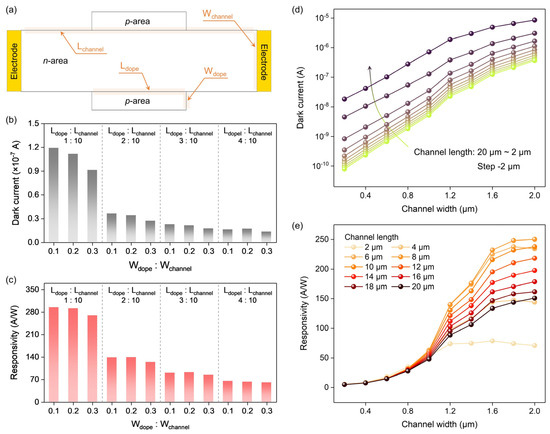 Effect of geometric structure on performance. (a) Schematic diagram of the structure of the PVPC. Channel length, channel width, doping region length, and doping region width are set as variable parameters (highlighted by light yellow). (b) Relationship between dark current and Wdope:Wchannel at different Ldope:Lchannel. (c) Relationship between responsivity and Wdope:Wchannel at different Ldope:Lchannel. (d) Relationship between dark current and channel width at different channel lengths. (e) Relationship between responsivity and channel width at different channel lengths. Doping concentration of channel is 1 × 1015 cm−3. Power density of 1550 nm illumination is 2 mW/cm2. For (b,c), channel length and channel width are fixed to 10 μm and 1 μm, respectively. For (d,e), Wdope:Wchannel and Ldope:Lchannel are fixed to 0.3 and 0.4, respectively.