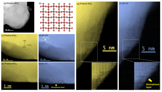 (a) High-magnification HAADF-STEM image of pristine WO3 particles. (b) Atomic structure model of monoclinic WO3 along the [001] zone axis. Gray atoms and red atoms represent W and O, respectively. (c–h) Atomic-scale HAADF-STEM images of WO3 particles before and after UV irradiation.