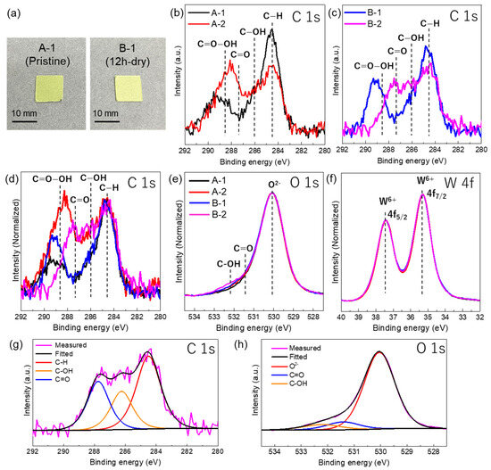 (a) Photographs of the A-1 and B-1 plates. (b) C 1s XPS spectra of the A-1 and A-2 plates. (c) C 1s XPS spectra of the B-1 and B-2 plates. (d) Normalized C 1s XPS spectra of all the plates. Explanation of each color line was same for that of Figure 3e. (e) Normalized O 1s XPS spectra of all the plates. (f) Normalized W 4f XPS spectra of all the plates. Explanation of each color line was same for that of Figure 3e. (g) C 1s spectra of the B-2 plate deconvoluted into three peaks. (h) O 1s spectra of the B-2 plate deconvoluted into three peaks.