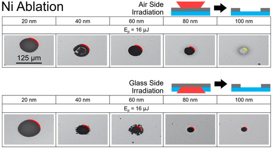 The evaluated thresholds are summarized in Figure 6. In order to interpret these thresholds, it makes sense to reference them to the melting threshold in fs-laser-excited Ni. The latter was obtained in two distinct ways. First, we used the experimental data by Wellershoff et al. [28]. Second, we calculated the melting threshold using Equation (5) and the heat penetration depth h = 25 nm obtained from the time-resolved reflectivity measurements. Quantitative agreement between these two curves in Figure 6a justifies the accuracy of both methods. As such, all damage thresholds in Figure 6a were found to exceed the surface/interface melting threshold in Ni. Therefore, we conclude that in the case of glass side excitation, nickel undoubtedly melts at the glass–nickel interface. Both the ablation and delamination mechanism would be mediated by the disruption of liquid nickel by giant negative pressures of the order of −5…−10 GPa generated by the complex thermo-elastic dynamics in partially melted nickel layers [23]. The amount of the absorbed laser fluence is definitely not enough to melt the entire nickel layer, suggesting that nickel always remains in the solid state at a Ni/air interface. For 80 nm and 100 nm nickel, thin film ablation occurs via the delamination of the entire film that tends to form closed cavities. The ablation mechanism is due to the disruption of the delaminated film by lateral stresses.