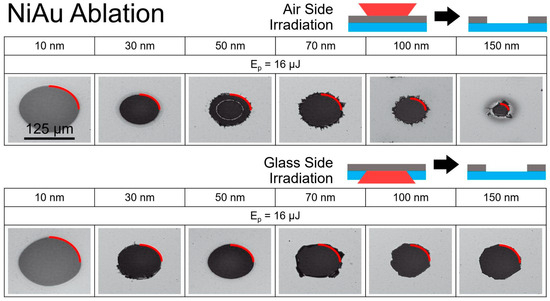 Figure 2 illustrates the results of irradiating Ni/Au films. The dimensions of ablation holes were measured along the red quarter circles. Generally, the holes are larger for Ni/Au compared to Ni films of similar thicknesses under the same irradiation conditions. A significant size difference was observed for the 10 nm and 150 nm Ni/Au films in the case of air-side ablation. For thicknesses from 30 to 100 nm, the visible change was less pronounced. In the case of glass-side irradiation, a noticeable change was observed only for the 10 nm film, while the lateral sizes of the holes for other thicknesses remained consistent.