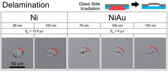 Irradiation below the ablation thresholds from the glass side of the samples led to the delamination of the films. The resulting structures are shown in Figure 3. For Ni films, delamination was observed for thicknesses of 80 nm and 100 nm with pulse energies below 14 μJ. The delamination structures on Ni/Au bilayers were obtained with lower pulse energies (Ep < 7 μJ) for Ni thicknesses of 70 nm, 100 nm, and 150 nm.
