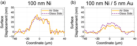 While the complete removal of the films is clearly indicated by the formation of dark holes following laser irradiation, the delamination process is less apparent. To examine the morphology of the resulting structures, interferometry measurements were conducted. Interferometry, a non-contact method for analyzing surface morphology, enables the examination of both the top surface and the profile of the glass-side surface. We utilized Michelson interferometry in the Linnik configuration, employing quantitative Fourier algorithms for profile reconstruction [22]. The results reveal a surface displacement of 20–30 nm for the 100 nm Ni film from both sides (Figure 4a). A smaller displacement of 10–20 nm was observed for the Ni(100 nm)/Au(5 nm) bilayer (Figure 4b). These findings indicate the presence of delamination. Films with thinner layers show smaller or similar displacements.