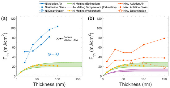 Ablation and delamination thresholds as a function of thickness for Ni (a) and Ni/Au (b) thin films, subjected to irradiation from both the air and substrate sides. The individual dots denote the thresholds evaluated using Liu’s method (for ease of visual interpretation, these dots are interconnected by lines). The black crossed point in (a) is a threshold value for incomplete Ni ablation. The green lines and the shaded area represent the calculated nickel/substrate interface melting threshold given by Equation (5) for h in a range from 20 nm to 30 nm. The purple lines/shaded area represent the calculated fluence required to heat the nickel at the Ni/Au interface to the melting temperature of gold (1377 K). Yellow squares represent the fs-laser-induced melting thresholds at the nickel–air surface, experimentally obtained by Wellershoff et al. [26]. The thickness mentioned for NiAu refers to the thickness of the Ni layer deposited on a 5 nm Au layer, which is situated on the glass substrate.