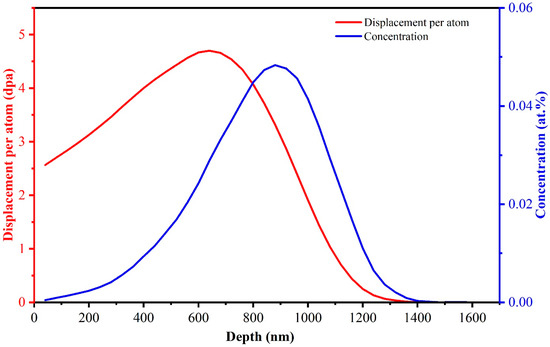 The as-sintered CeO2 pellets were ground from 400 grid to 5000 grid by using SiC sandpapers, and then polished with 1 μm diamond suspensions. The polished samples were irradiated at room temperature by 4 MeV Xe ions with a fluence of 2 × 1015 ions/cm2 using the 320 kV platform for multi-discipline research with highly charged ions at the Institute of Modern Physics, CAS (Lanzhou, China). The irradiation damage profile and the depth distribution of implanted Xe ions were calculated using the quick Kinchin–Pease model with the Stopping and Range of Ions in Matter (SRIM) 2013 software [30,31]. The threshold displacement energies for Ce and O elements in cerium dioxide were set to 56 eV and 27 eV, respectively, as reported in reference [32]. The concentration of Xe ions reaches a peak value of approximately 0.05% at a depth of 880 nm, with a displacement damage of 3.35 dpa, as shown in Figure 1. Post-irradiation annealing was performed in a muffle furnace placed in a glovebox. The annealing temperature was set to 600 °C for 3 h to simulate the edge temperature of the pellets during service.