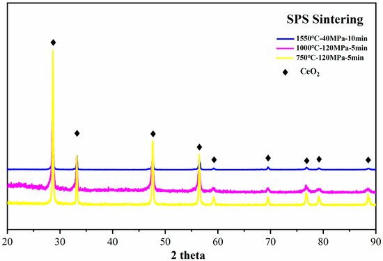 The XRD patterns of as-sintered pellets, from 750 °C to 1550 °C, display characteristic diffraction peaks that are well indexed to CeO2 as shown in Figure 2. The results indicate that the phase constitution of the sintered pellets by SPS is single-phase CeO2, and the stoichiometry of the CeO2 sintered pellets remains constant during different SPS sintering temperatures.