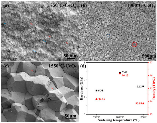 The cross-section fracture surfaces of the sintered CeO2 pellets at different sintering temperatures (a) 750 °C; (b) 1000 °C; (c)1550 °C; and Vickers hardness and density of as-sintered CeO2 pellets (d).