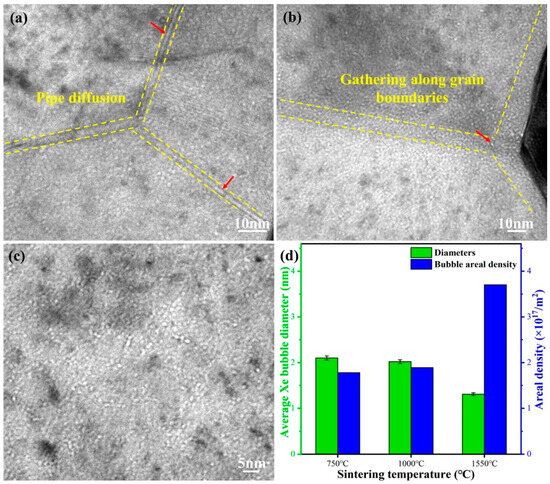 The distribution of Xe gas bubbles in the 4 MeV irradiated CeO2 pellets followed by annealing at 600 °C for 3 h: (a) the pellet sintered at 750 °C; (b) the pellet sintered at 1000 °C; (c) the pellet sintered at 1550 °C; and (d) average diameters and areal density of Xe bubbles.